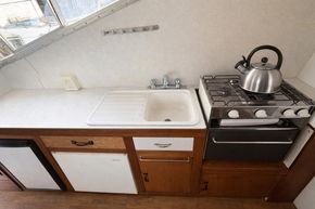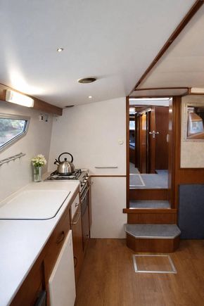 The galley kitchen provides ample storage and work surfaces and comes equipped with a fridge, freezer, and small cooker.