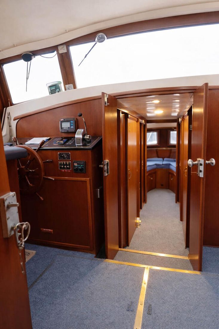 An electric sliding roof amidships offers panoramic views and makes navigation easier when cruising. Powered by a BMC 2.5 diesel engine, Athos provides reliable performance for inland waterways.