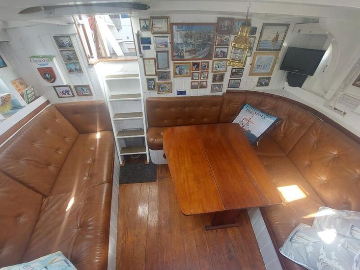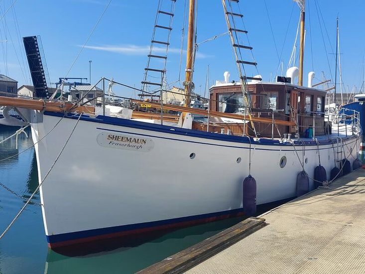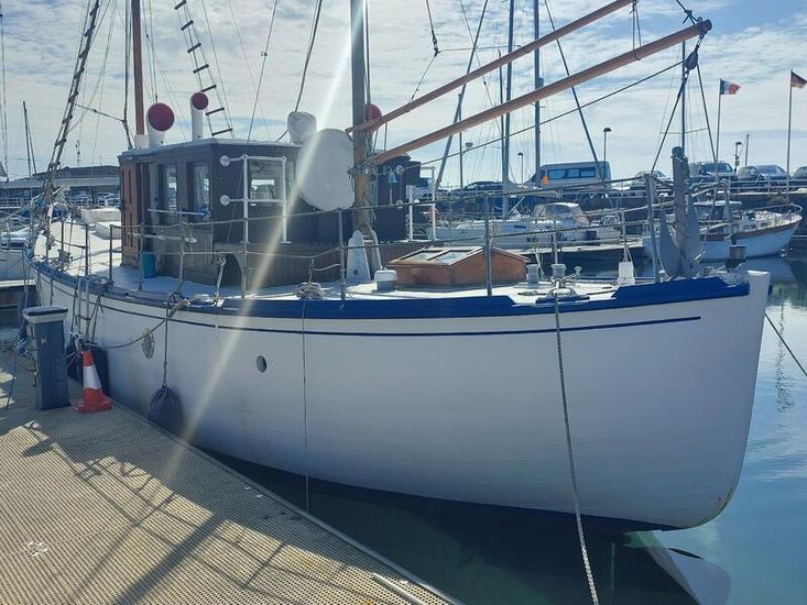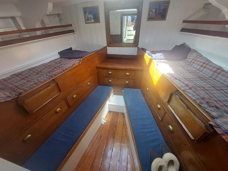 Built to Lloyds A1 specification in 1935. Elm keel and oak keelson. The frames, deadwood and fore and aft stems are of stout Oak. The planking below waterline is one and three-quarter inch Pitch Pine and above the waterline it is one and three quarter-inch Larch and British Columbian Pine. The original fastenings are by way of wrought-iron four-inch spikes and eight to ten-inch bolts. In the past thirty years a number of planks have been replaced, the new ones fastened with stainless steel screws and stainless-steel bolts. The removed iron spikes were found to be in good condition. The beams are of massive Oak, set into Oak Beam Shelves. Oak hanging and lodging knees give added strength and rigidity by way of the Main and Mizzen masts. The planking is one a half inch British Columbian Pine set fore and aft and in good condition. In 1990 this was ply sheathed and epoxy sealed and is now secure and leak-free. Bollards and fairleads are all cast-iron and secured with heavy bolts. The stanchions are cast-iron zinc plated. They are all individually cast in Port and Starboard pairs. Her deck is British Columbian pine (1¼ inch) set fore and aft. In the 1990s this was sheathed in epoxy and is leak free, laid on oak deck beams. All teak deck/wheelhouse. Outside helm position at aft end of wheelhouse. Included in the inventory is a purpose made all round winter wheelhouse cover.