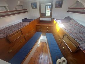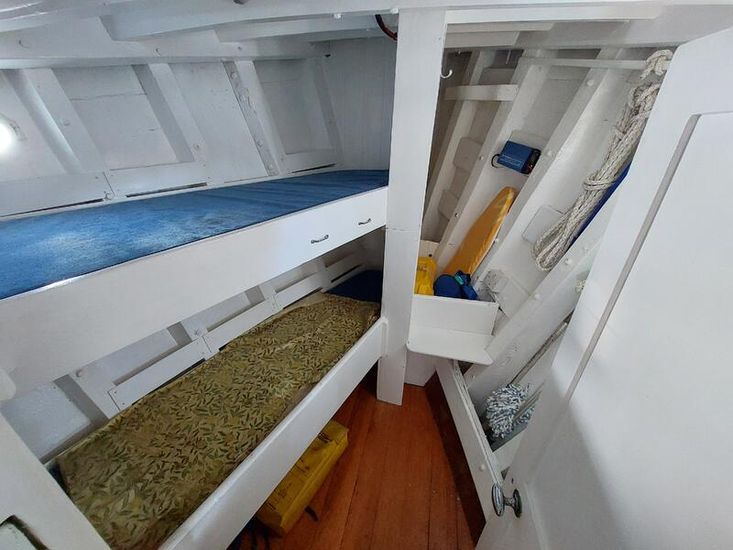 FOC’SL - Two full length berths to port. Sail locker forward. Hanging locker to starboard with access to forward manual bilge pump to stb’d in locker, fishing rods. Forward access and escape hatch. Mains socket low down at aft bulkhead. Ladder for top bunk access is stowed under the deck-head. Forward part of the Foc’sl provides stowage for the sails. Also holds the 12v sealed 110 amp/hr battery that supplies the Winch Motor. This battery is on constant intelligent charge via its own dedicated 12v charger.