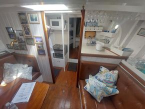 SALOON - Good locker space under the seats. Mains electric sockets are 1 at floor level starboard side, 2 at the starboard galley work surface and 3 at the port side. There is a ‘hidden’ locker behind the re-curved part of the portside seating, accessed under the triangular lid. The Avtex TV /radio/CD player is mounted on the port side and should be secured with its strap when putting to sea. The immersion heater switch is located below the saloon companionway stairs. There is a manual bilge pump located under the seat just to the port side of the companion way stairs. The inertia/fluxgate sensor is the ‘black box’ mounted on a stbd oak frame at back of setee.