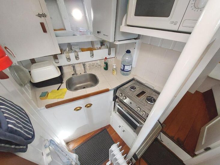 GALLEY - To port is the sink. Two taps supply pressurised hot & cold water. Drinking water is stowed in 5L bottles in the locker beneath the stove and under the aft cabin bunks. On the for’ard bulkhead above the tiled work surface there is a Cool Cabinet which works fine for drinks, butter and even milk.