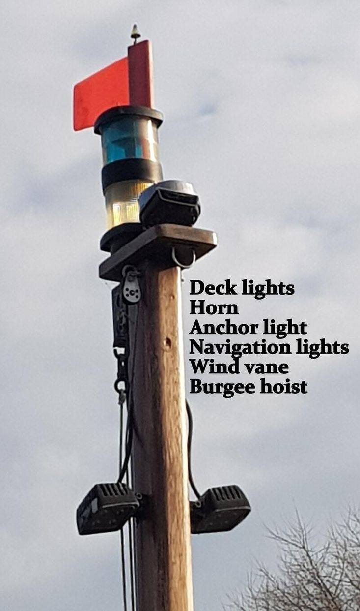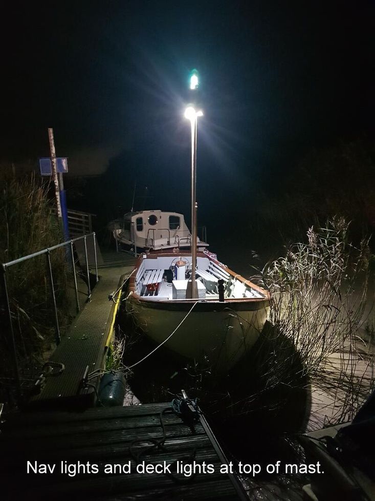 3.8m mast fitted in a tabernacle with quick realease. Navigation lights & deck lights fitted on the mast.