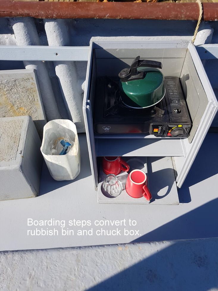 Epoxy-treated marine plywood deck, tanalised & pressure treated timber seating for 6 people. Boarding steps incorporating a gas hob. Overall cover.