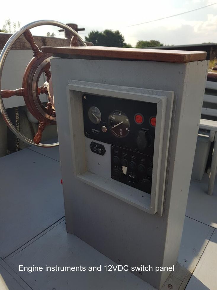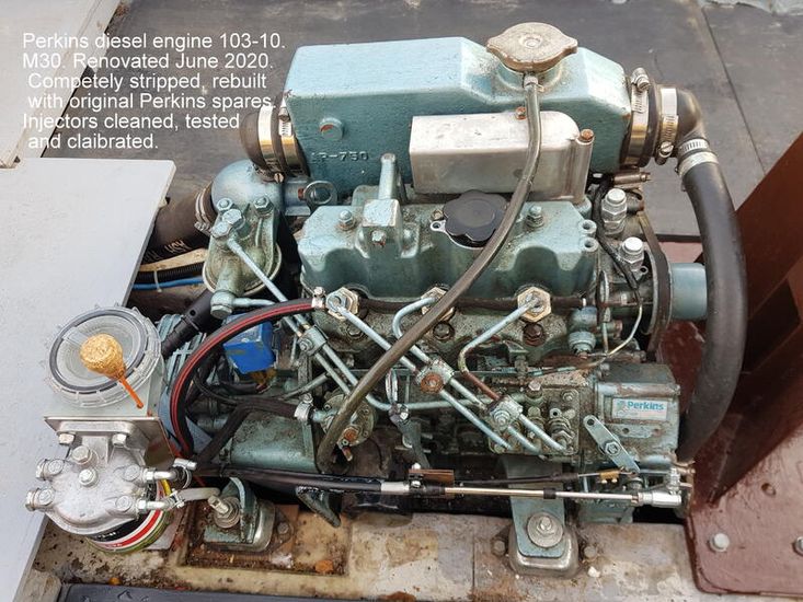 Perkins 103-10, 30hp diesel. Serial number: 45765W. Maximum speed: 6kts. Last serviced: June 2020 (including new gaskets, O-rings, jubilee clips, injectors cleaned & tested). Engine hours: 16 since rebuild. Drive type: PRM 90 gearbox, shaft & right-handed propellar. Fuel capacity: 25 litres. Hydraulic steering. Vetus exhaust system. Single 60Ah battery charged from the engine. Solar panel.